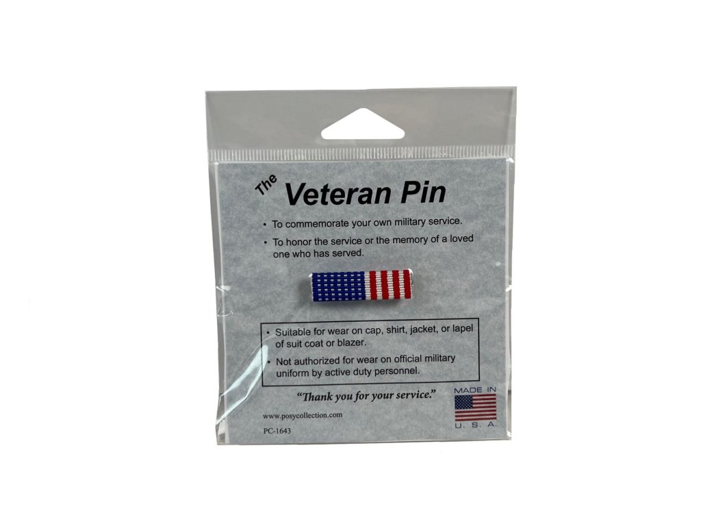 Veterans Pin. Sold on Amazon, this service ribbon pin is inspired by our American flag and intended for civilian wear. Mounted on a card and encased in a poly bag, the Veterans Pin comes packaged ready to present to your favorite veteran or to wrap as a special gift.